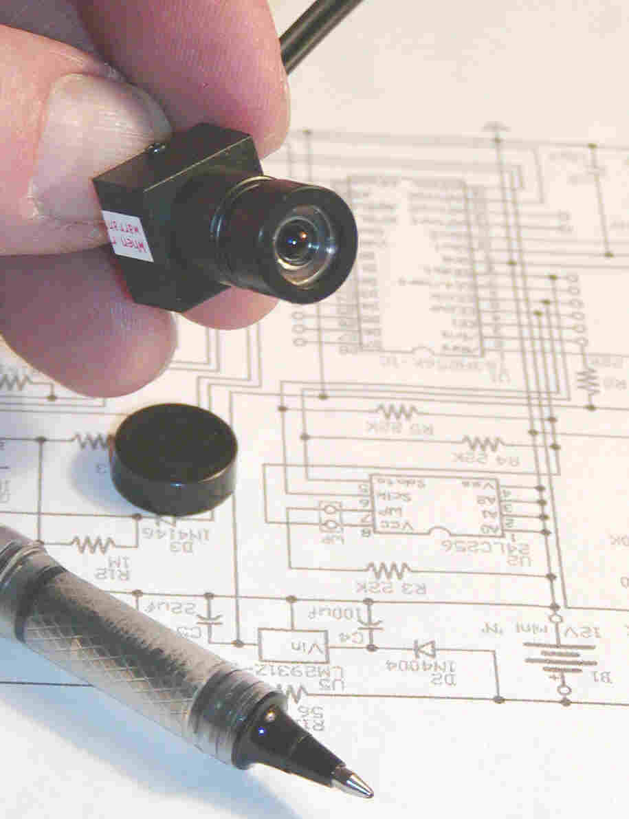 Yes, that’s my thumbnail. This camera is .6" square and 1.25" long with lens. We have a pinhole version of this camera (IT 51-XP), which makes it even shorter. The camera comes enclosed in a plastic case. If you need a covert camera with low power consumption that can be run on battery, that weighs 1/3 of an oz. and can be concealed easily, this is the camera you need. With a resolution of 280 lines, and auto shutter/gain and back-light compensation, you don’t need to set anything. This camera is perfect for model rocket or model aircraft use. The uses are boundless. I’ve used this camera when I had problems with "shrinkage" at our plant with almost instant results. This camera also sees in the infrared range. See our IR LED board to add the ability to make this a see-in-the-dark camera.